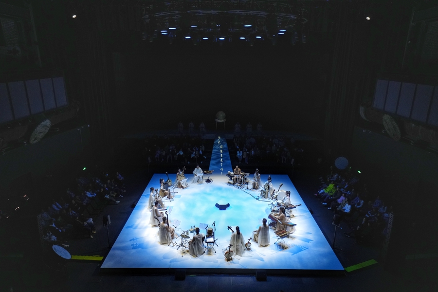 10月3日至4日,上海民族乐团原创口碑力作《云之上——让听觉从东方出发》在1862时尚艺术中心上演。舞台中央,14位演奏家围坐成圆,重构了声部秩序;中心舞台不远处的6位歌者如流动的音符穿梭其间,编织出第一重听觉梦境。