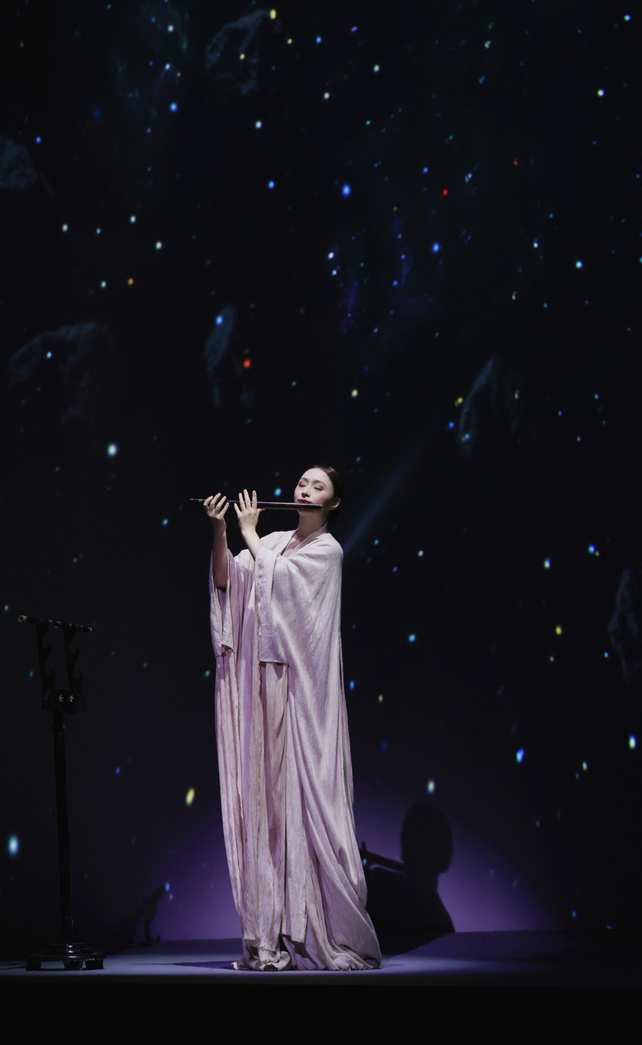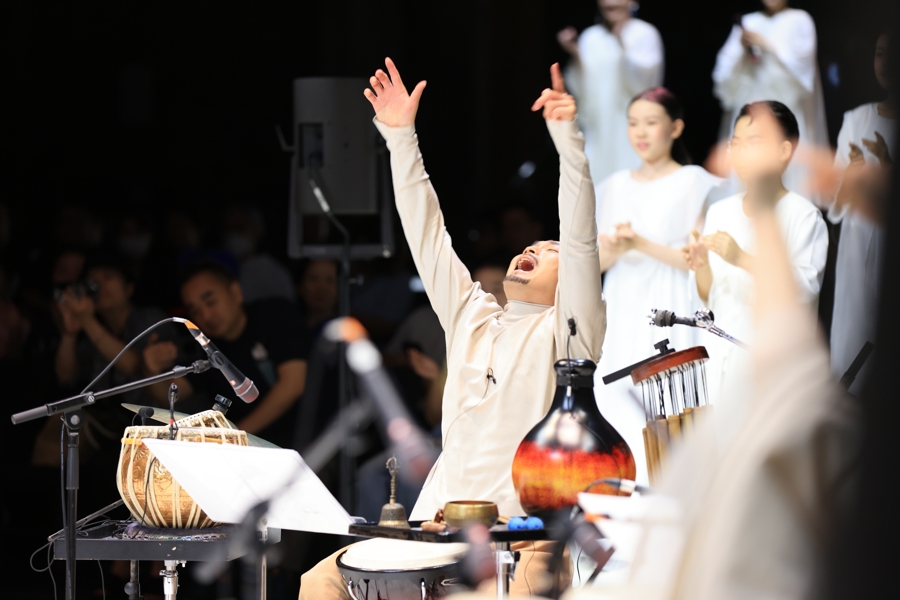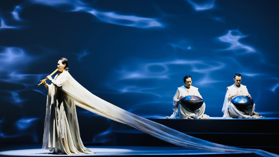 二楼看台上,6位鼓手与11位来自中福会少年宫合唱团的纯净童声组成“空中乐团”,与主舞台形成精妙的上下呼应,在剧场中构筑起一座立体的“声音建筑”,拓展了观众对民乐声场的想象。
